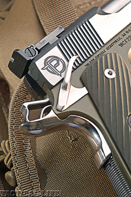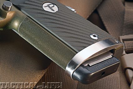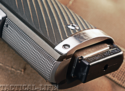 Perhaps the most eye-catching feature of the Night Shrike is its new Predator TacWell. PT’s magazine well is cut flush with the frame yet doubles the area of the chute. The patent-pending part requires the frame to be cut on the sides and the part slides on and is anchored with the mainspring housing pin. Once attached, the TacWell becomes part of the gun and is rigid without any play. The mag well opening is deeper in the back and requires a mainspring housing cut specifically for this mag well.