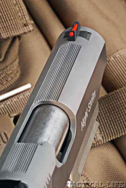The Night Shrike is available with a choice of front sights. This pistol was outfitted with a fiber-optic front sight.