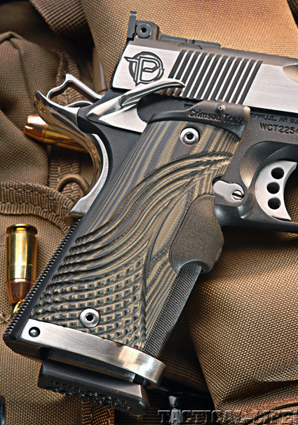 The grips are machined from rugged G10 Micarta material and cut to fit the PT TacWell. They have colors to match all of the different frame colors. While I was in the shop, Burkett showed me a new generation of Crimson Trace Master Series grips that had been fit to a Night Shrike. The new grip does not require shortening the weak-side safety.