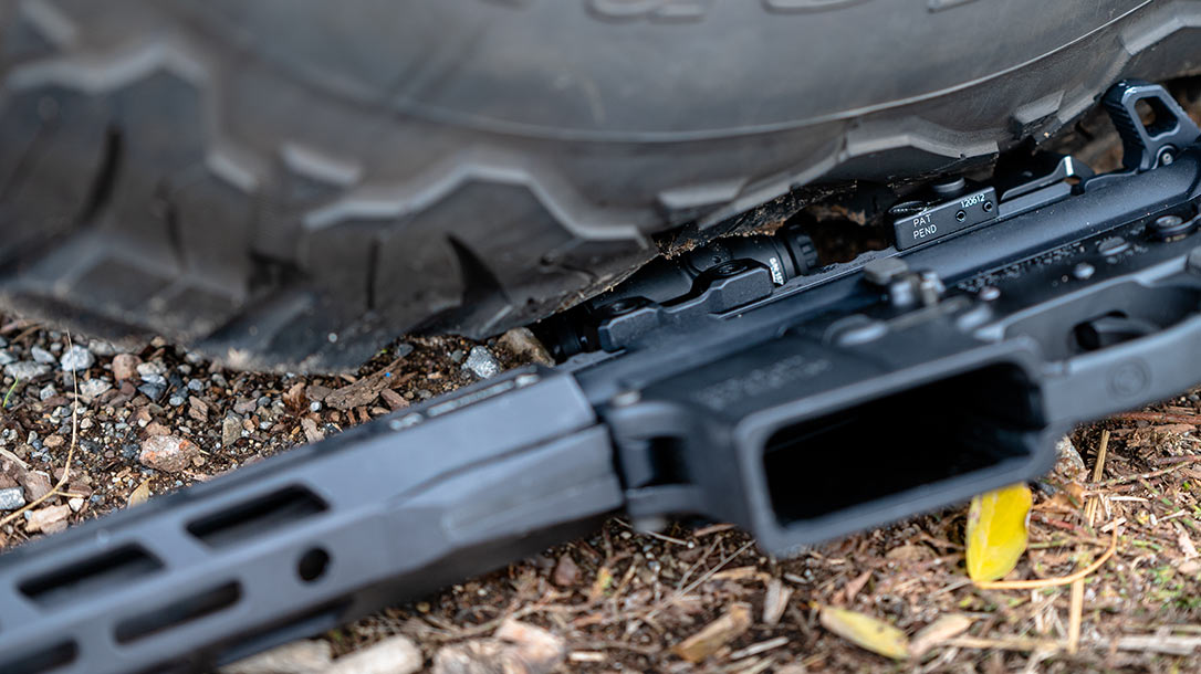 The PA SLx Microprism and RA Watchman LE were placed on a medium-packed dirt and gravel country driveway. Then I took my truck with oversized 285/70/17-inch AT tires and ran them both over. To add insult to injury, I put my truck in reverse and went back over them again.