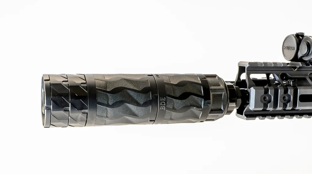 I mounted PWS’ own BDE 556 Ti Suppressor. This 3D printed titanium silencer contains removable baffles for easier servicing at the end-user level. Its design allows users to customize the length and noise reduction to their liking. The PWS BDE 556 Ti has taper threading to prevent carbon locking and loosening between the baffles and features a universal ⅝ x24 TPI thread pattern for mounting. PWS claims that the precision engineered baffles strategically minimize backpressure, therefore enhancing firearm performance. Even after my frangible ammo debacle that I experienced at Thunder Ranch, the BDE 556 Ti Suppressor has served me well. With frangible ammo, I noticed it was rather sparky. Some of this is to be expected for a titanium silencer that is well “broken-in” like mine.