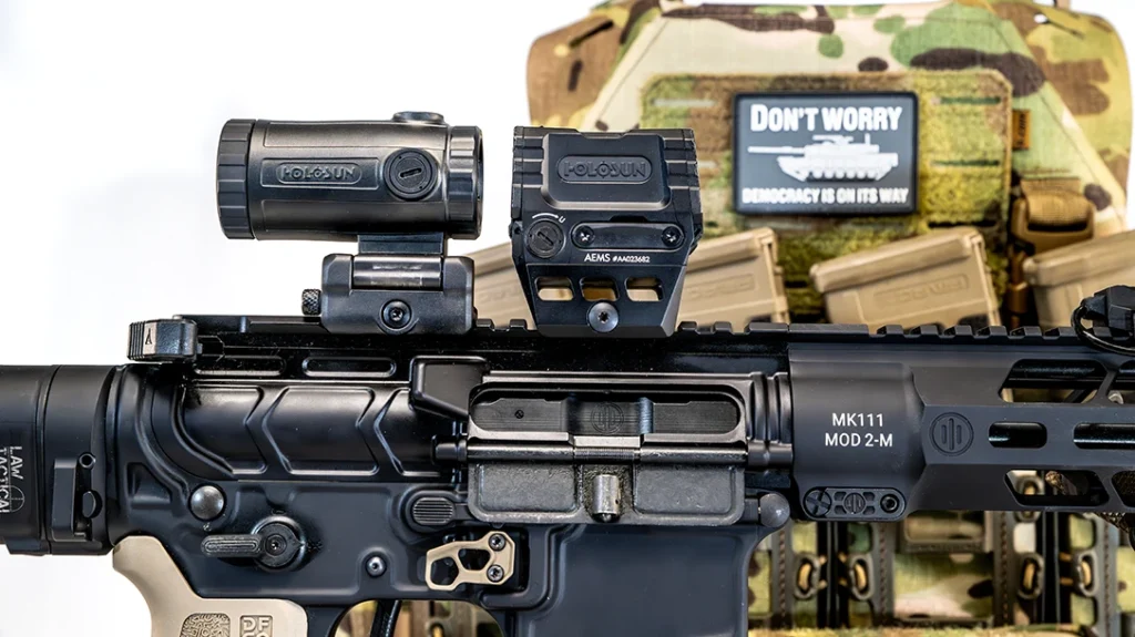 I opted to go Holosun for all of the optics on my Primary Weapons Systems MK111 Mod 2-M. My primary optic is AEMS-PRO-X2-RD. This sturdy unit has a 2 MOA center dot and an optional 65 MOA outer circle. for choices of reticles. The AEMS features many of Holosun’s signature details, like its Solar Failsafe and shake-awake. With the Holosun AEMS, everything is contained inside of a Grade 5 titanium housing. Grade 5 titanium has double the tensile strength and likely 5 times the fatigue strength of 7075 series aluminum. To boost my primary optics’ capabilities, I opted for Holosun’s HM3XT fixed 3x power magnifier. It features a factory flip-to-side mount, and this unit provides me with additional target identification abilities. It goes without saying that it will let me shoot further with the MK111 Mod 2-M and the AEMS too. This red-dot and 3x fixed magnifier makes a great combo. It’s also a nice alternative to shooting with an LPVO.