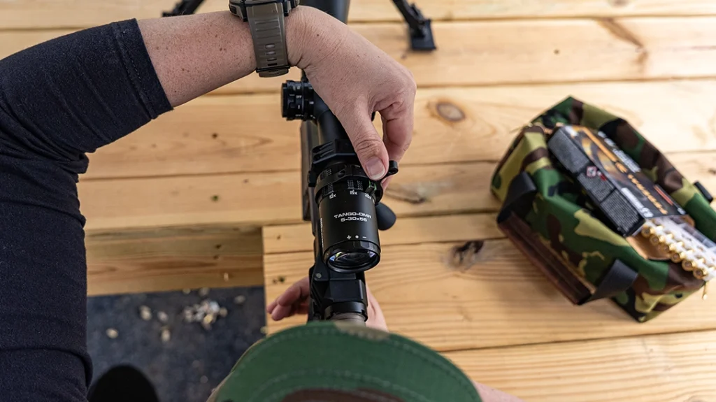 The Sig Sauer Tango DMR 5-30x scope is on the more affordable end of long-range scopes but still of quality. It is also legal to use in PRS’s Production division. You want a long-range scope with a zero stop on the elevation dial to make it easy to set it back to zero without looking at the dial. The first focal plane MRAD reticle makes it easy to hold for elevation and windage if needed. I’ve never used a throw lever with fiber optics to mark the magnification level, but this feature is helpful after shooting in rainy and overcast conditions. Sig Sauer also sent scope rings that came with a leveling tool. Something else I appreciate about the scope rings is the inch-pound torque specifications engraved on the rings themselves. Sig can’t make it any more straightforward than that!