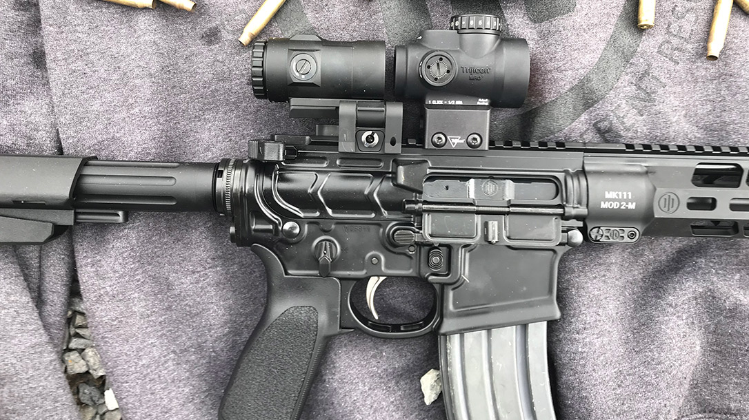 Drills with the PWS MK111 MOD 2-M quickly moved past stand-and-deliver drills to more dynamic drills involving movement, magazine reloads and firing from behind cover. A Trijicon MRO HD was in place. The MRO HD expands upon the original MRO by offering both a 2-MOA dot and a segmented reticle more likely found in a laser holographic sight than a sealed reflex sight.