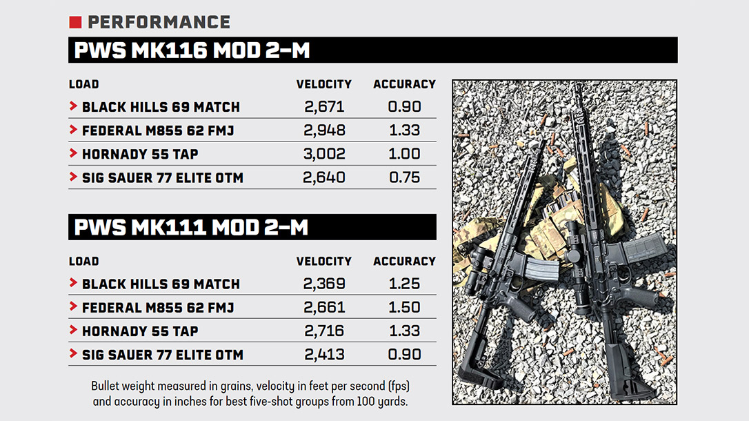 The PWS MK116 MOD 2-M displayed excellent accuracy with Black Hills Ammunition 69-grain Match and 55-grain FMJ; Federal M855 62-grain FMJ; Hornady 55-grain TAP and Sig Sauer 77-grain Elite OTM. Measured velocities ranged from 2,946 to 2,660 feet per second (fps), depending on bullet weight.