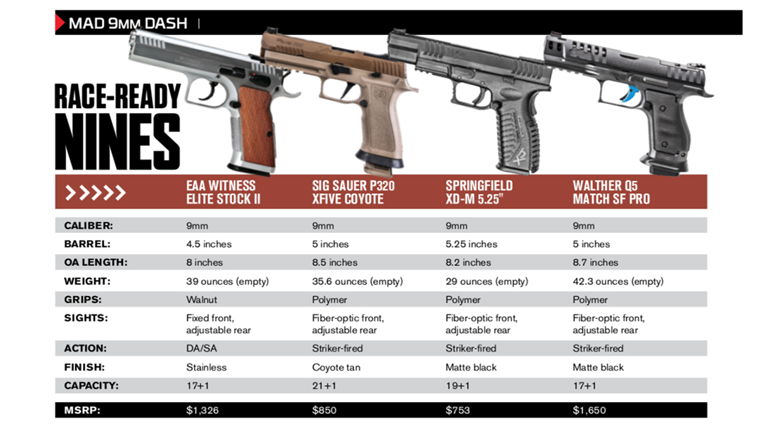 Of course, there are various action pistol disciplines, but we decided to restrict our test to those guns that are “legal” for USPSA’s Production division. In other words, each gun must be as close to factory stock as possible with iron sights, no barrel porting or compensators or weights, and only 10 rounds of ammo in each magazine. You only have to meet “minor” power factor requirements as well, so we chose only 9mm pistols: the European American Armory (EAA) Witness Elite Stock II, Sig Sauer P320 XFive Coyote, Springfield XD-M 5.25” and Walther Q5 Match Steel Frame (SF) Pro.