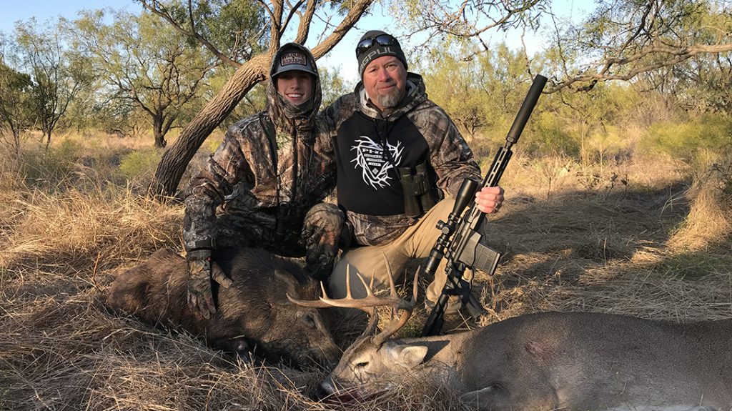 After racking the bolt, Ethan whispered to me that a hog remained out in the open probably wondering what just caused that deer to nosedive into the turf 30 yards to his left. The suppressor had effectively mitigated the normal muzzle blast. The compact Rem 700 CP swung around as Ethan whispered, “Pop that pig!” in my ear. I quickly obliged. The deer and the hog ended up about 10 yards from each other; it gave me a nice story to tell even if my deer came up short in the measurement department.