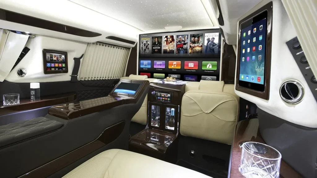 A refreshment bar with proper glassware replaces cup holders, because details matter. A retractable privacy partition houses a TV with Apple TV integration, while iPads manage controls and entertainment. Overhead, a starry night headliner with ambient lighting creates a calm, private atmosphere that feels wildly out of place in a vehicle capable of driving through chaos.