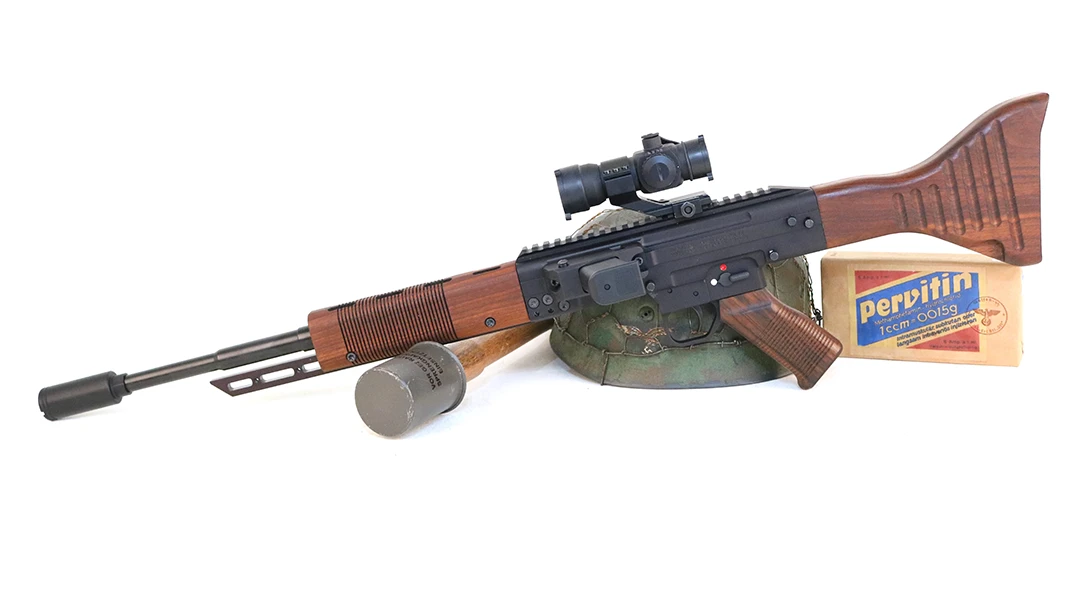 The basic layout does indeed mimic that of the Type II FG42. The furniture is an attractive stained hardwood, and the pistol grip sports a comfortable, normal cant. The gun feeds from the left like the original paratrooper rifle. There is a length of Picatinny rail up top for optics.