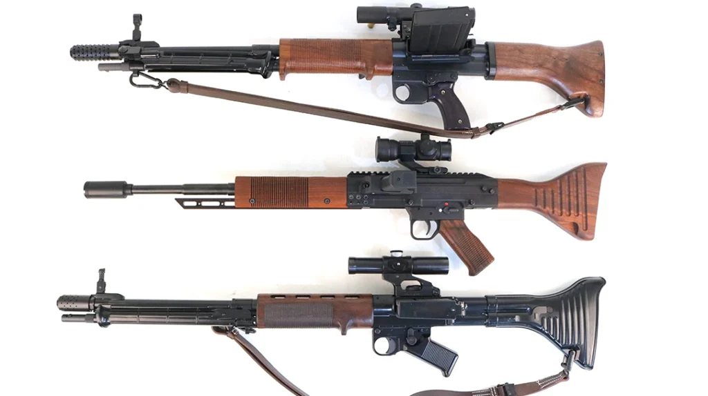All FG42’s fired full-power 7.92x57mm rifle rounds from a 20-round side-mounted magazine. The gun ran from the closed bolt on semi-auto and the open bolt on rock and roll. This feature aided in barrel cooling in rapid fire. The two major variants were actually just different points along the gun’s wartime evolutionary tree.