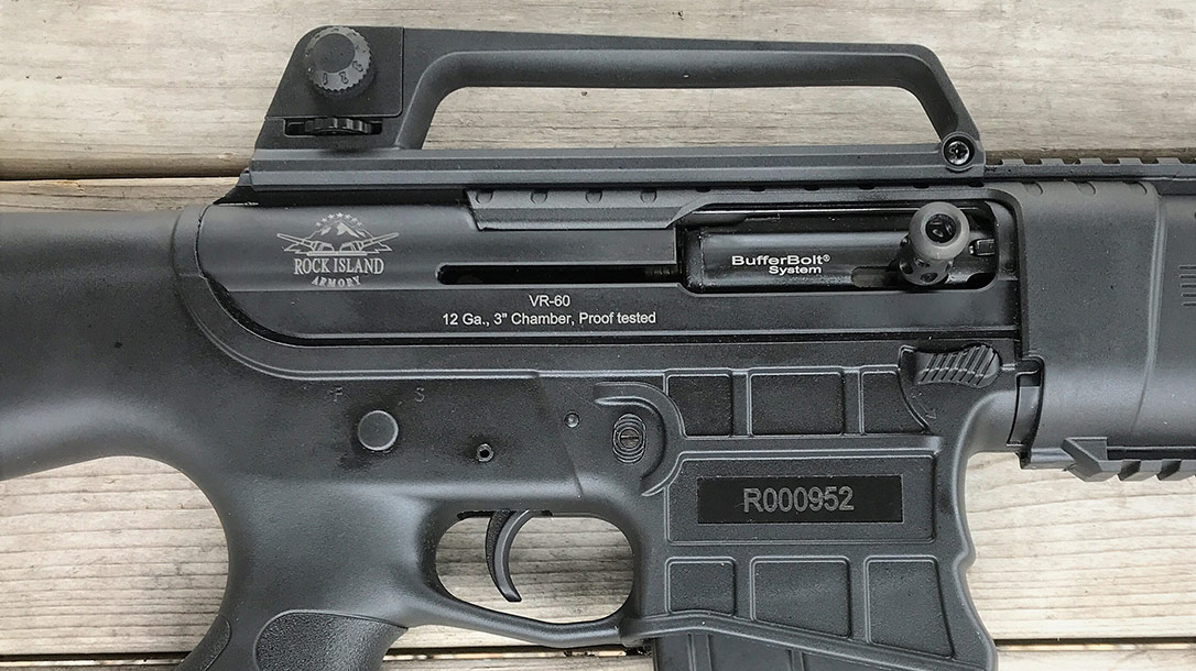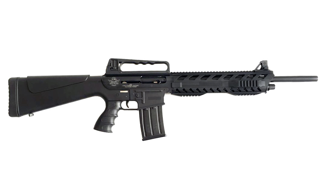 With this premise, Rock Island Armory (RIA) has produced a new semi-automatic 12-gauge shotgun. It not only resembles the AR outwardly, but has controls—safety, bolt catch and magazine release—in the same place. Plus sights that closely resemble those on the M16A2.