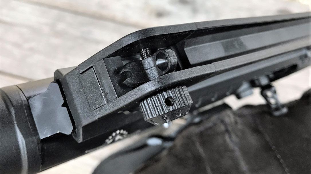 The handguard/rear-sight assembly is removable, along with the front sight. The buttstock, with recoil pad, finger-groove pistol grip and magazine well, are also one big polymer assembly that attaches to the lower portion of the aluminum alloy receiver.