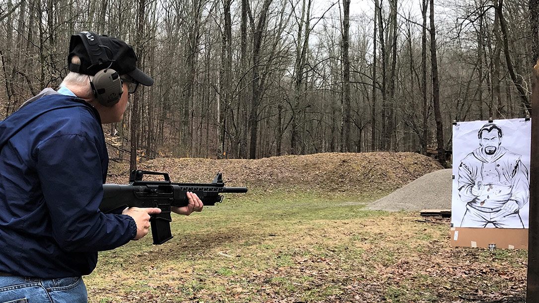 Here, with the shotgun again at high-ready and on safe, I took off the safety, and fired five shots as fast as I could using the sights. I knelt, assessing the situation as I reloaded made the gun safe, and then advanced to 7 yards. With the butt of the Rock Island Armory VR60 tucked into my side, just below my armpit, and the muzzle pointing at the target, I engaged sans sights with the last five shells.
