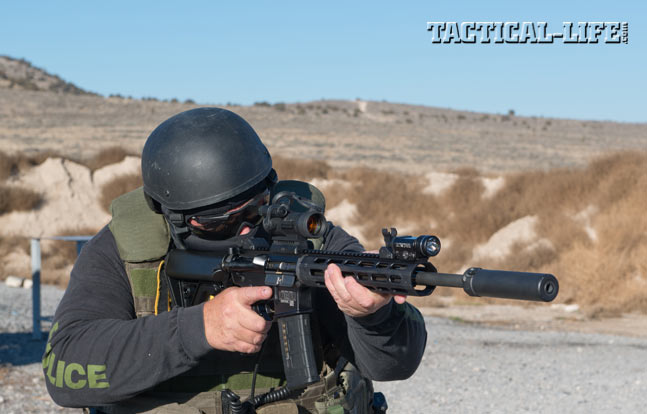 Next I replaced the Bushnell scope with the Aimpoint PRO. While optics are great and fast becoming my preference on duty rifles, the Aimpoint PRO remains one of the most popular among officers and is perfectly suited to close-quarters work. It also makes for a pretty light and well-balanced system.
