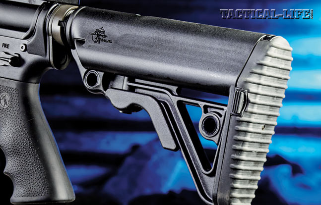 RRA’s Operator CAR butt-stock features a compartment for storing batteries and accepts sling swivels at both the front and rear.