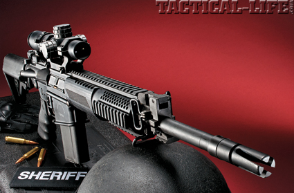 Officers need .308-caliber weapons like the LAR-8 to defeat barriers and go the extra distance. Shown with a Weaver Tactical 1-5x24mm scope in a YHM mount.