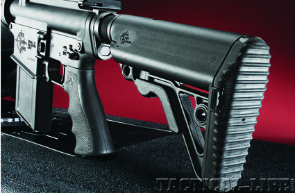 The adjustable Operator CAR stock provides a solid cheekweld and shooters can store batteries behind the buttpad
