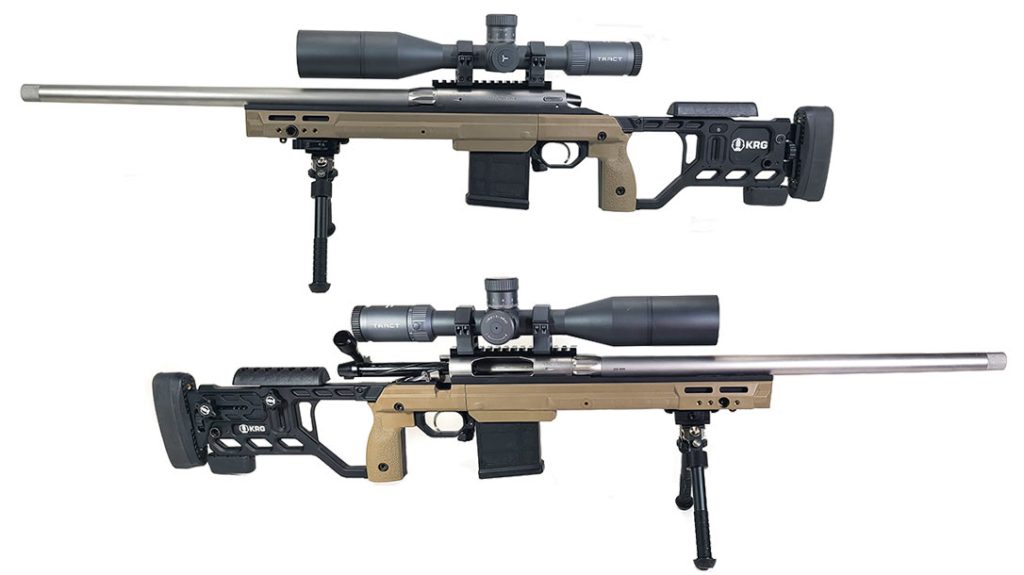 The rifle’s receiver includes a 20-MOA aluminum Picatinny rail. The rifle also has standard scope base holes drilled into the receiver should you choose to run conventional ring mounts. The rifle is mounted in a Kinetic Research Group Whiskey-3 Chassis.