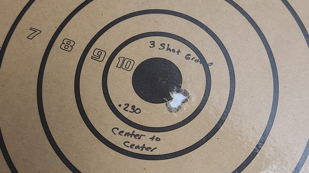 All three brands performed well, but the Hornady ELD seemed to fit the gun the best. It gave me a very nice .35-inch group, which is impressive. I am uncomfortable in listing these rounds in order of group size because they all performed very well. I was not remotely happy about packing the rifle up and heading off the range. When you get a gun like that, you want to shoot it all day.