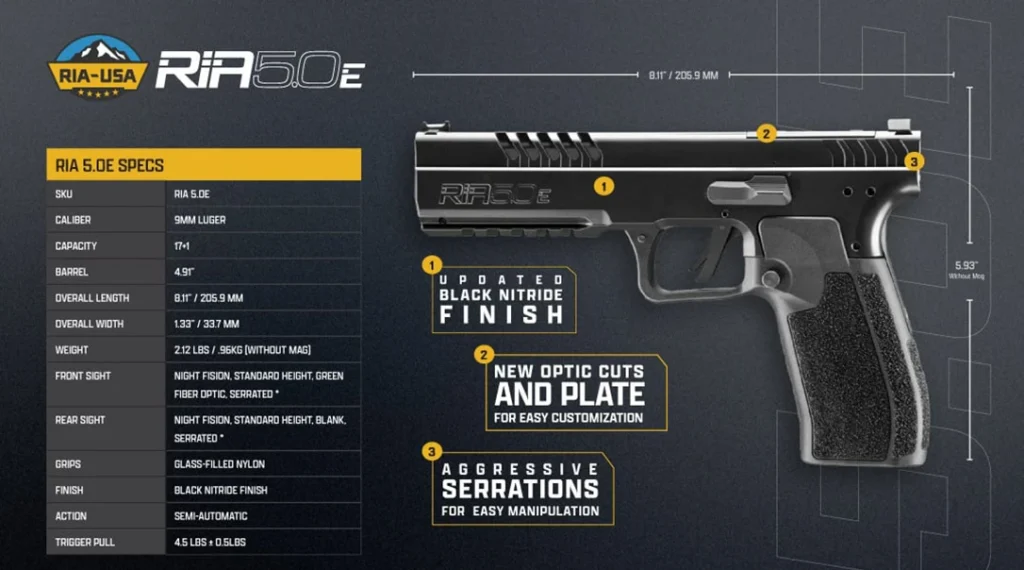 Proudly crafted in the USA by American craftsmen, the RIA 5.0E embodies the dedication to quality and innovation that defines RIA-USA. Every detail, from its ergonomic grip to its precision engineering, reflects RIA’s commitment to delivering a flagship firearm that meets and exceeds the highest standards of performance and reliability.