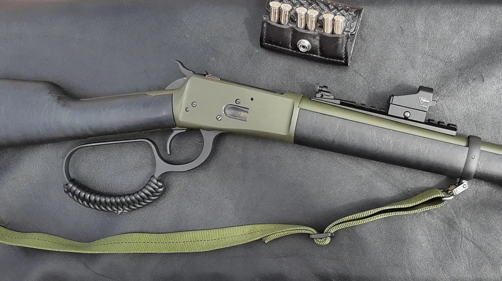 The wood was painted black, and the frame and barrel were finished in a striking OD green Cerakote (Rossi calls it Mossy Green). The knurled cap at the end of the short barrel indicated that it was threaded. In addition, there was a section of Picatinny rail atop the barrel with a peep sight affixed at its rear. Finally, the stock had a rubber recoil pad and was fitted with sling swivels.