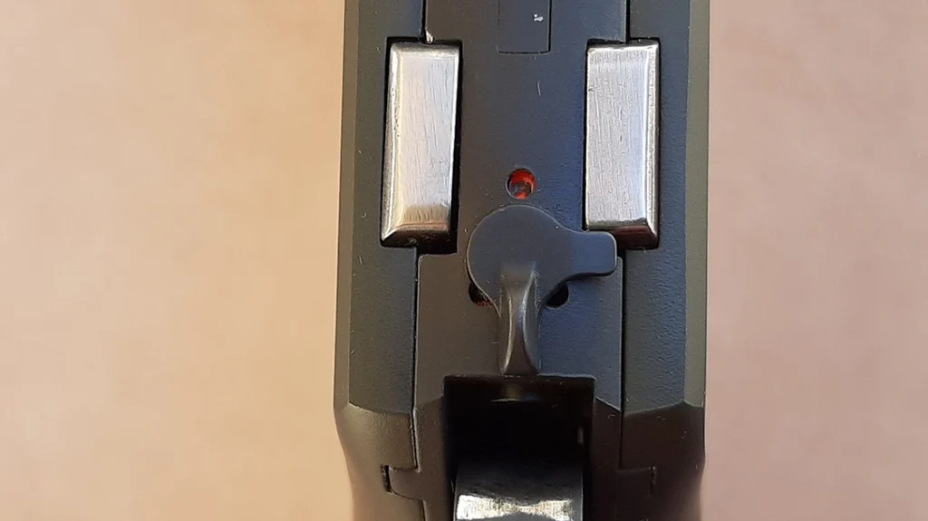 Rossi adds a small manual safety on top of the bolt just aft of the locking lugs. It’s a simple lever that can be rotated 90 degrees to block the firing pin when engaged. A small red painted circle shows in front of the safety when it’s disengaged.