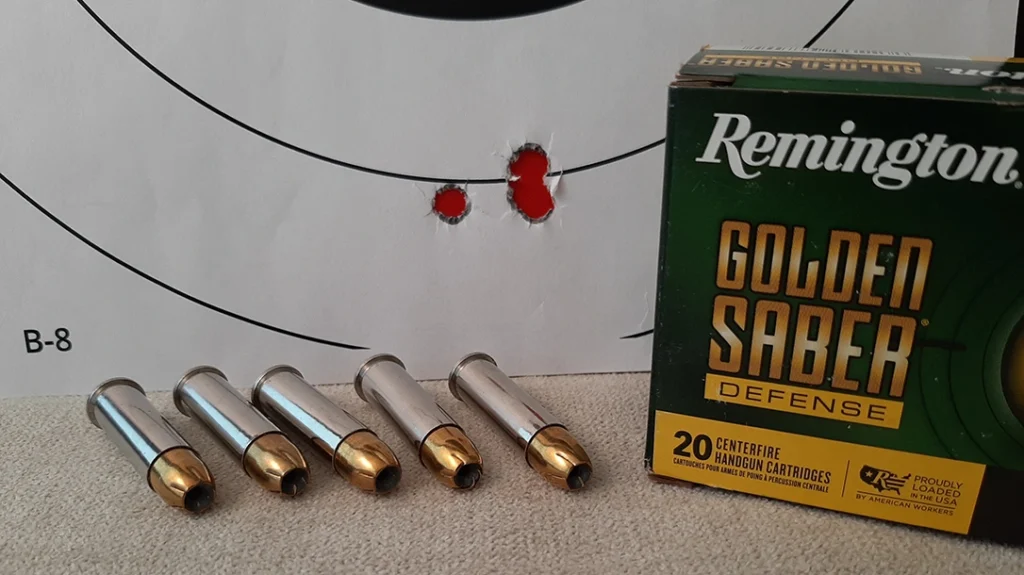 Remington’s .38 +P 125 gr. Golden Sabre averaged 1351 fps—50 fps faster than the .357 version reached from the 4.25-inch Python. It was long enough to feed reliably from the R92; recoil was poofy, and it was amazingly accurate. It would make a perfect home defense load, especially for the recoil sensitive.