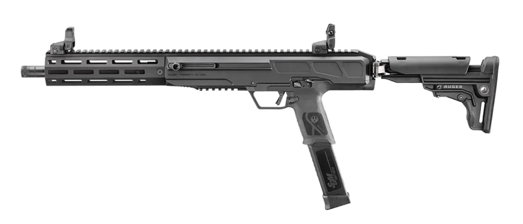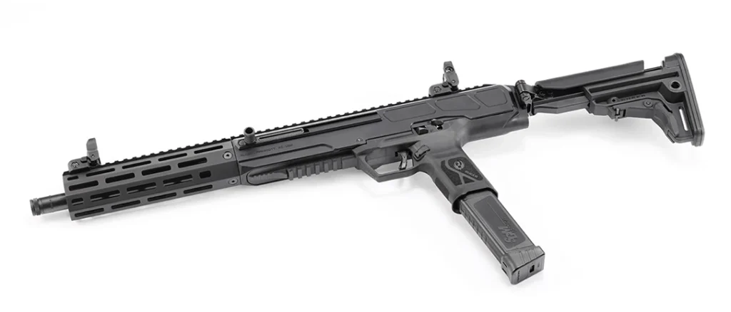 With the folding stock fully collapsed, the gun is just over 30 inches long, making it easy to store, transport, and maneuver within tight spaces. A black anodizing job covers the entirety of the rifle, keeping it looking sleek and simple.