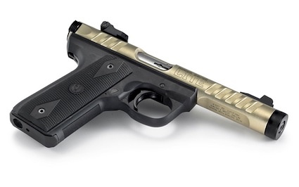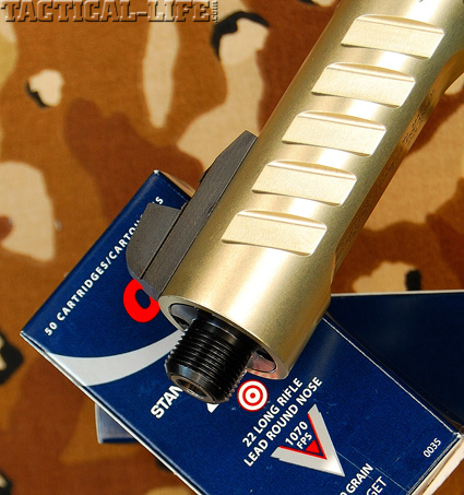 Making an already lightweight pistol even lighter, the upper receiver is built of gold-anodized aircraft grade aluminum alloy with a 4.5-inch stainless steel barrel insert held in place by a blued steel tension nut that also features external 1/2×28 threads for mounting a suppressor.