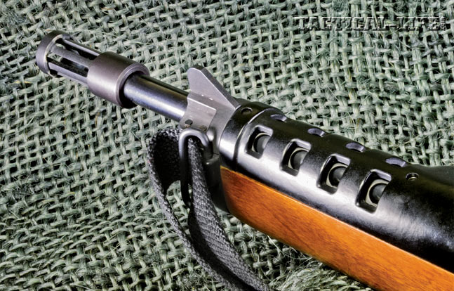 Those who like piston guns should like the AC-556, as it uses a fixed-piston, self-cleaning system. It may only be fired when the bolt is locked, as the firing pin retracts mechanically during the firing cycle when the bolt unlocks. When the mag is empty, the AC-556’s bolt locks open. As with the M14, the mag needs to be rocked into place. Short-barreled AC-556K versions do not have a bayonet lug, while those with longer barrels generally do. This lug is designed for the M7 bayonet originally used on the M16, and it will also work with the current M9 bayonet. For those familiar with the M1 or M14 rifle, disassembly is similar (though the selector should be set on semi-auto): The triggerguard is sprung open and removed, after which the barrel/receiver assembly may be removed from the stock. Those very familiar with the AC-556 warn that during disassembly a small link between the selector switch and auto sear can be easily lost. Watch out!