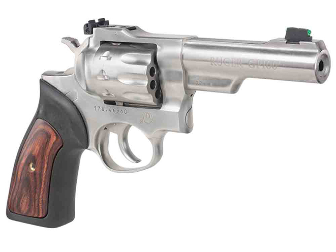 The .22 LR Ruger GP100, meanwhile, sports a 10-shot capacity. This double action revolver also features a fiber optic front sight, adjustable rear sight, stainless steel construction, cushioned rubber grip with a hardwood insert, and a four-inch barrel.