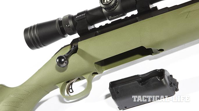 The muzzle sports the popular 5/8×24-tpi threading so you can mount a muzzle brake or sound suppressor. And there’s the lightweight polymer stock with Power Bedding, composed of two steel bedding blocks that fix the location of the receiver in the stock. In addition, the barrel floats freely above the forend, which has a molded polymer internal honeycomb reinforcement. Combine all of this with a well-executed overall matte finish and an integral Picatinny scope rail, and the result is a rifle designed for accuracy from the get-go.