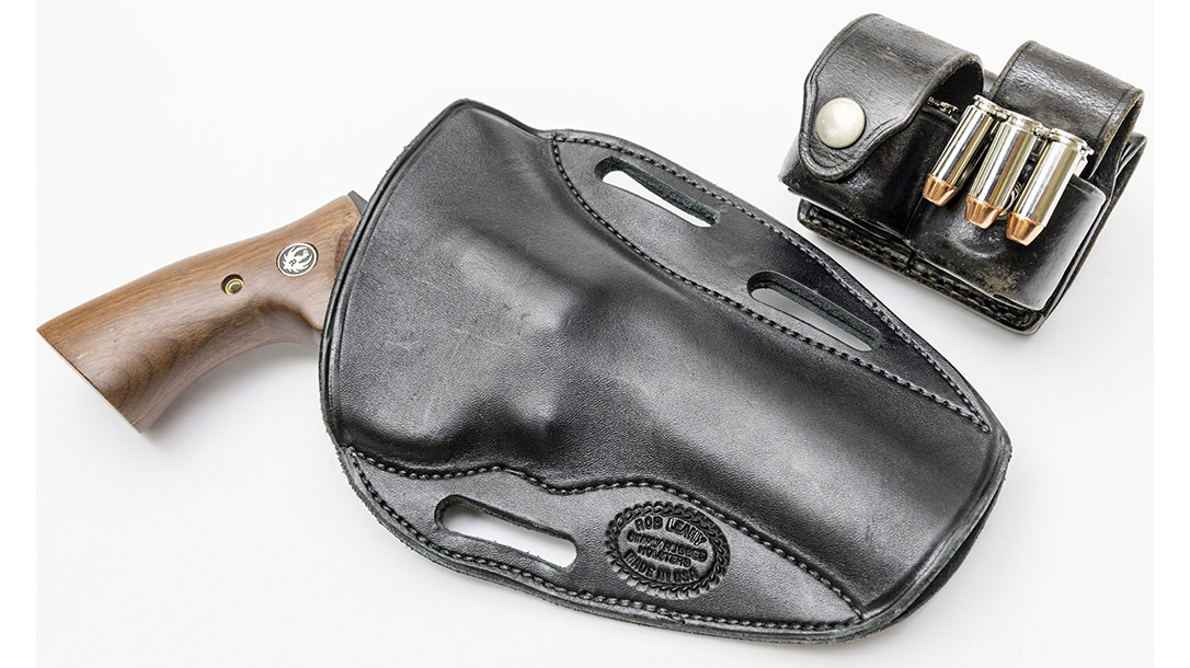 I chose five different 10mm loads and one .40 S&W load for this test, with bullet weights ranging from 122 to 230 grains. To pack the Lipsey’s GP100 10mm on my belt, I had Rob Leahy at Simply Rugged Holsters make me one of his Sourdough Pancake holsters. His leather products are constructed from 8- to 9-ounce Hermann Oak beef hide, and I had mine finished in black. This is a high-riding, open-top belt rig that can be worn on the hip or in a cross-draw position. It has three 1.75-inch belt slots, and the molding offers good retention. The holster encloses the entire revolver but leaves the back of the triggerguard exposed for a good grip on the gun, allowing for quick draws. To carry the moon clips, I used vintage HKS speedloader carriers that I altered for the task.