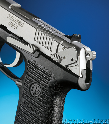 The P95’s no-snag three-dot sights are easily visible, and the slide-mounted safety/decocker is shown engaged in the down “safe” position. Ambidextrous controls are lefty-friendly, with decocker and magazine release levers identical on both sides.