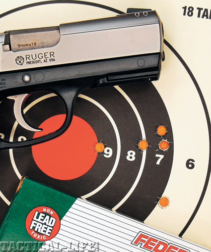 That session in the pit was actually done along with two other test pistols from other makers, for other projects. The first was a rimfire pistol that had nothing but jam after malfunction after failure, the second was a sub-compact 9mm pistol with a two-finger grip and a stiff double-action-only trigger. The Ruger was last, and after the frustration of the first pistol and having to concentrate so strongly on maintaining sight picture through the long DAO pull on the second while hanging onto the little critter under recoil, the P95 was nothing but relaxing and a great way to end the day. Bullet weights from 100 on up to 147 grains and FMJs, JHPs, and JSPs all blew through it like butter, the grip is comfortable, the sights are visible, the DA trigger was smooth with some barely noticeable stacking before the break, the single-action pull let go at 5 pounds with minor creep, and recoil was very easy to deal with. With zero malfunctions, the 95 proved to be very shootable gun.