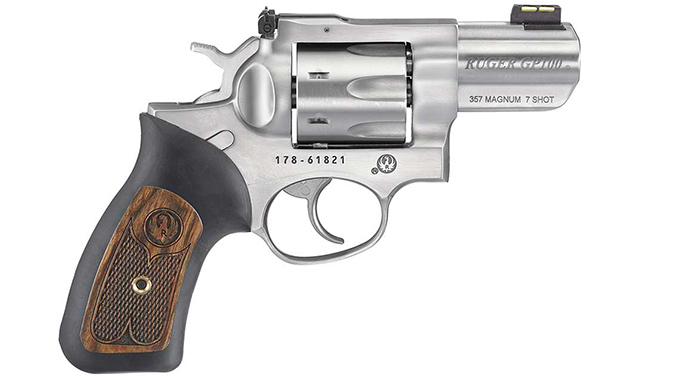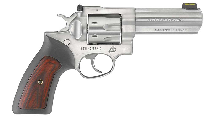 Next, the Ruger GP100 lineup has expanded with three new seven-round models in .357 magnum. The three models are available in 2.50-inch, 4.20-inch, and 6-inch barrels, and all boast one-piece rubber grips with hardwood inserts, fiber optic front and adjustable rear sights. The MSRP on each is $899.