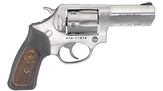 First up, the compact, stainless SP101 is now being offered in .327 Federal Magnum, which Ruger says “approximates” the .357 Magnum’s performance while allowing for an increased capacity to six rounds. This wheelgun sports a three-inch barrel, fixed sights and a cushioned rubber grip along with engraved wood panels. MSRP: $749.