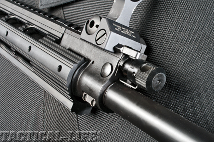Rather than using a more common A2-style birdcage flash suppressor, the SR-556E employs a classic Ruger-style slotted suppressor on its threaded muzzle.