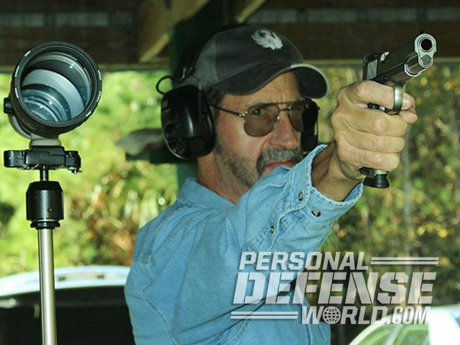 To test the pistol’s accuracy, I fired three 5-shot groups with each load at 25 yards. The bench testing indicated that the SR1911 Target tended to shoot tighter groups with the Black Hills and Freedom Munitions loads. Overall, groups fired from the bench were 3 to 5 inches in size. Some groups would have been smaller, but there was a tendency for an occasional flyer to open up the groups. I measured the velocities using a Competition Electronics ProChrono chronograph. The Black Hills ammo was the fastest load, and the most powerful was the Sig Sauer ammo, which left the barrel at 867 fps and generated 384 foot-pounds of energy at the muzzle.