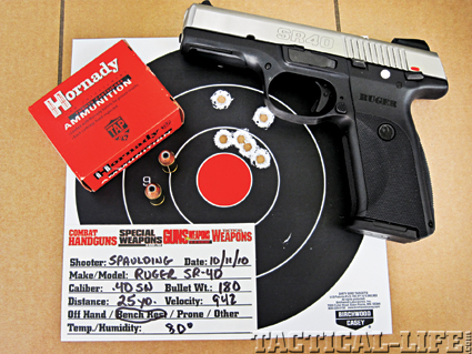The SR40 showed a distinct preference for the Hornady 180-gr. EXP load tested, averaging 1.50 inches at 25 yards.