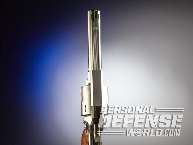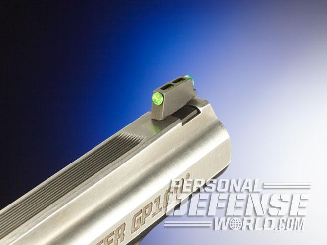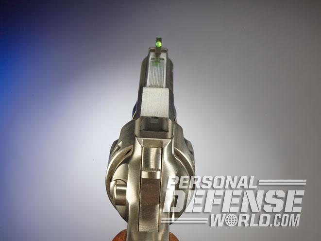 Ruger started by re-contouring the standard GP100 .357 Magnum frame. The topstrap and top of the barrel have been dropped a bit, providing better balance and quicker sighting. The 4.2-inch barrel is slab-sided with a grooved top, a contoured underlug and an 11-degree target crown. Novak sights allow for fast aiming and make it perfect for concealed carry. A green fiber-optic front sight is installed above the barrel, and a black Novak LoMount rear sight is dovetailed into the topstrap. Both of these sights can easily be replaced to suit your needs, though they’re very functional and easy to use right ouf of the gates. They help make the GP100 Match Champion so versatile.
