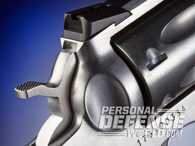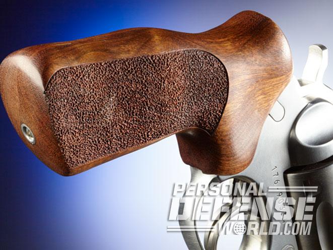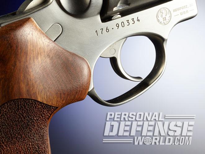The GP100 Match Champion’s internals are machine tumbled to smooth most of the sharp edges, which results in a really nice trigger pull. The double-action (DA) pull is smooth, yet it does not lighten the single-action (SA) pull inappropriately. The chamber mouths and ejector have a slight chamfer that facilitates ejection and faster reloads. The revolver will not, however, accommodate moon clips. The GP100 Match Champion holds six rounds of .357 Mag or .38 Special ammo. The Hogue hardwood grip has a slightly flared bottom, stippling and relief cuts on both sides. It facilitates a nice high grip on the GP100, and its lack of finger grooves means a wider range of shooters can use the gun.