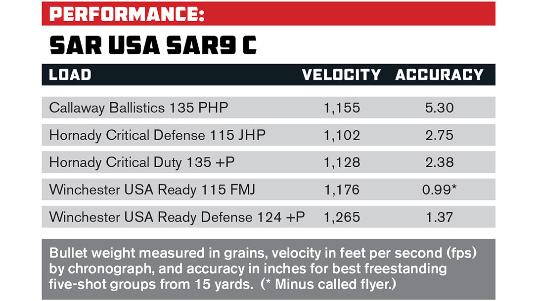The stiff springs and lack of a red-dot option may dissuade those with weak eyes or wrists. But aside from that, there aren’t many shooters who won’t find the SAR9 C to be an excellent pistol.