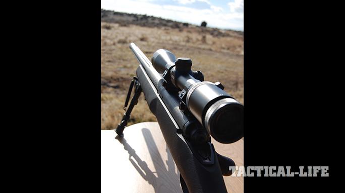 To measure the rifle’s inherent accuracy, I attached a Harris bipod to the forend, then positioned the rifle on my portable bench. I fired a couple of rounds from 25 yards to get the bullets printing on paper, then adjusted the scope until the point of impact was just 1 inch above the bullseye. Then I moved the target until it was 100 yards away and fired a three-shot group.