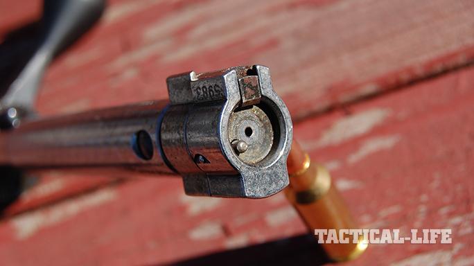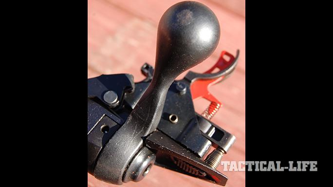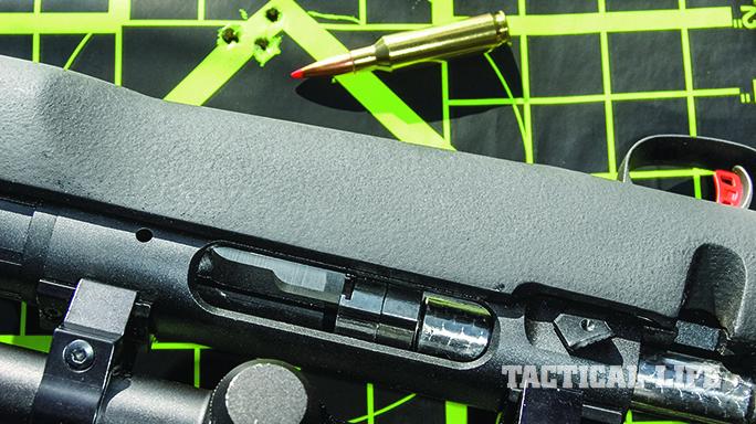 The bolt face is fully recessed, protecting the shooter from possible case failures or gases leaking from punctured primers. Twin front lugs provide a solid lockup, while a plunger ejector and a spring-loaded extractor make for positive ejection. The oversized bolt handle is easy to grasp. The bolt body is machine-jeweled—an attractive touch.