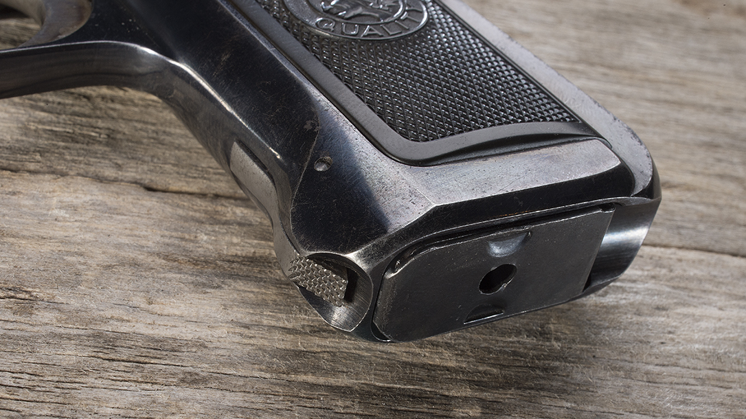 The extractor, which runs along the barrel from the front to the rear of the port, also protrudes slightly when a cartridge is chambered, providing a visual and tactile indicator. That variation is also marked on the top of the slide with “Cal. 32” and “7.65 .M-M.” The 10-round box magazine has four rounded, rectangular witness holes and two magazine catch slots in the front.