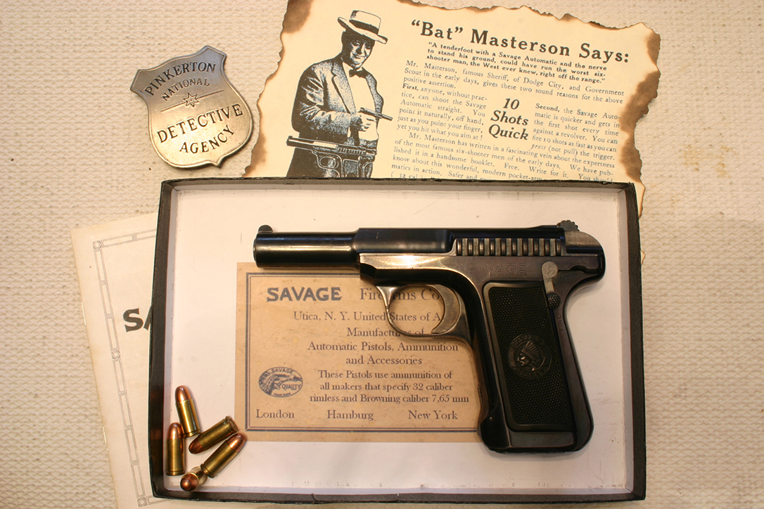 At first, the Savage ads for the new pistol stressed the, “10 shots quick!” and, “Aims as easy as pointing your finger” slogans. However, accolades soon flowed into the company from notable users such as Buffalo Bill Cody; firearms expert E.C. Crossman; former outlaw Al Jennings; William Pinkerton, of the Pinkerton National Detective Agency; W.J. Burns, of the Burns International Detective Agency; lawman-turned-sportswriter W.B. “Bat” Masterson; and Maj. Richard Sylvester, president of the International Association of Chiefs of Police. In one of the Savage ads, Masterson said, “A tenderfoot with a Savage Automatic and the nerve to stand his ground, could have run the worst six-shooter man, the West ever knew, right off the range.”