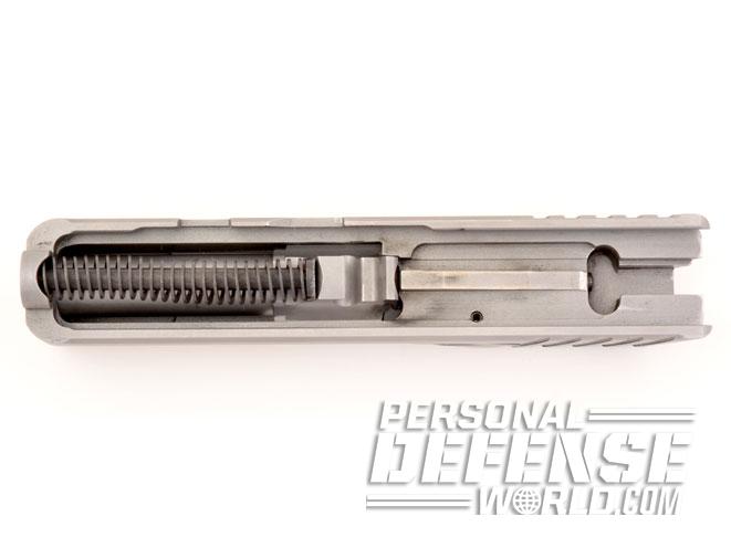 Roebuck said, “You need that clearance when the barrel unlocks, but you don’t want any clearance when it is locked up, you want that barrel solid when it is locked up.” Since the barrel is already locked at the rear of the lug, the CPX-3’s recoil system forces the front of the barrel downward. It is this feature that uniquely defines the Quad-Lock. Looking at the CPX-3’s slide from the front, it has a crescent-shaped gap just above the barrel while the bottom of the barrel is sitting almost flush against the muzzle opening. It looks off center but it’s not, because the muzzle opening in the CPX-3 slide is not round.