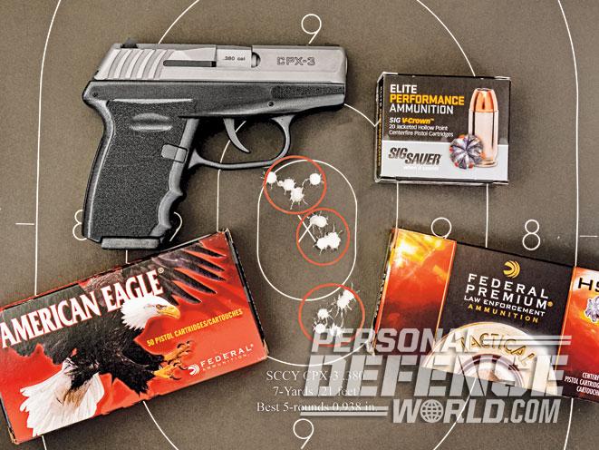 There were no failures to feed or malfunctions with all three brands of ammo. As for recoil, even the heavy-hitting 99-grain Federal was more than manageable, and the pistol’s white-dot sights were quick to reacquire from shot to shot. The most impressive of all was the consistency and ease of trigger pull, which, combined with the SCCY’s Quad-Lock design, keeps this little .380 in the center of center mass.