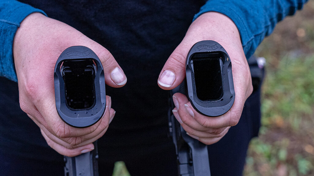 After a trigger modification on most factory handguns, I always look for an aftermarket magwell and compatible base pad extensions. A mag well is an essential upgrade to make for competition shooting that assists in faster reloads on the clock. Base pad extensions are a necessary upgrade to increase capacity to remain competitive against other shooters who are also running higher-capacity guns or base pads. Walther Arms knows this about competition shooting, and instead of the customer looking for aftermarket accessories, they manufactured the Walther PDP Match pistols with the enhanced magwell. The steel-frame version includes extended base pads to hold 20 rounds instead of the factory 18. The magwell requires the use of the aluminum base pads, as the standard polymer base pads will not seat in the magwell.